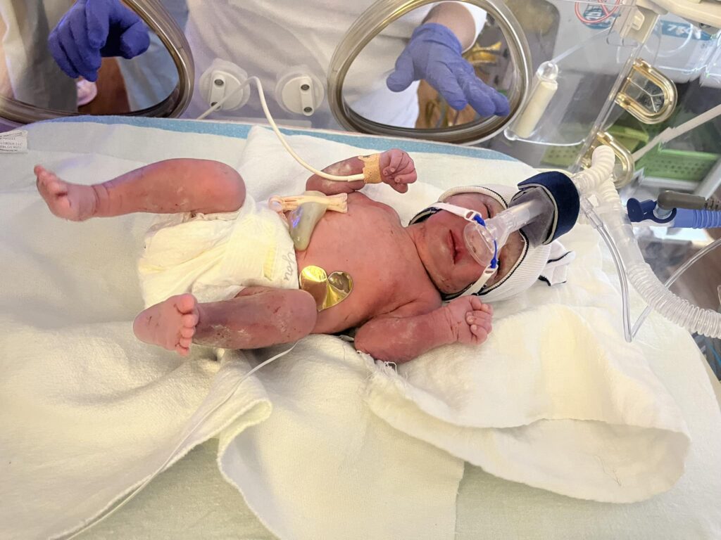 Nació justo antes de las 36 semanas y me pusieron una inyección para ayudar a sus pulmones. Necesitó oxígeno inmediatamente, pero rápidamente lo bajaron a bajo flujo.